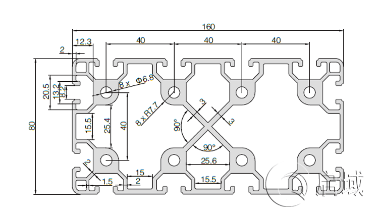 材料:鋁合金 Material Aluminum(6063-T5) 單位質量Weight:10.1kg/m 長度Length:6.0m 集合慣性 Mass of lnertia: lx:260.20 cm4 ly:130.10 cm4 截麵慣性 Section modulus: Zx:64.20 cm3 Zy:32.10 cm3